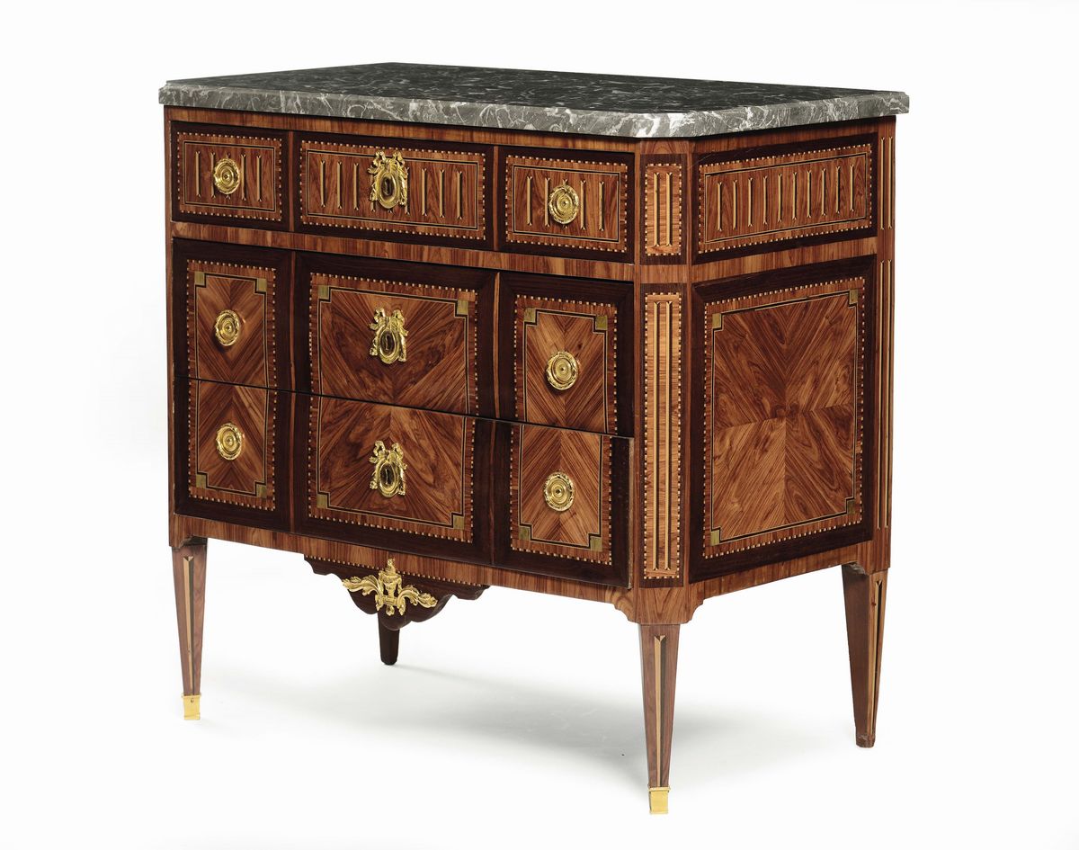 Cassettone Luigi XVI lastronato ed intarsiato, Francia XVIII secolo