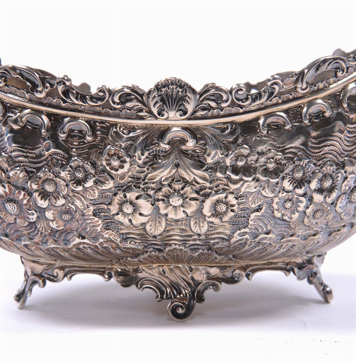 Centrotavola in sheffield sbalzato e cesellato a motivo floreale, Oxford XIX secolo