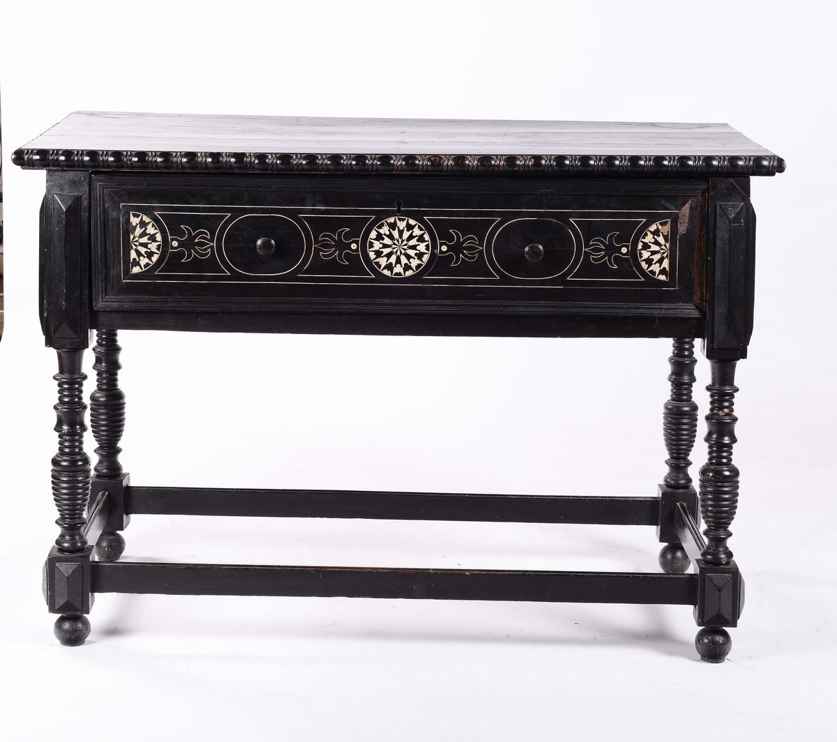 un cassetto sulla fascia intarsiato in avorio a motivo geometrico, montanti a rocchetto riuniti da traverse, cm 132x63x91 (difetti)