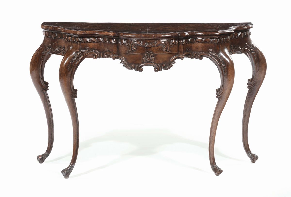 alte gambe arcuate, piano sagomato, fascia intagliata e decorate con volute ed elementi vegetali, cm 130x55x75