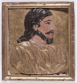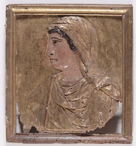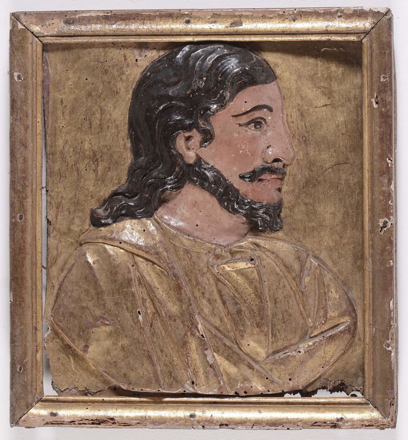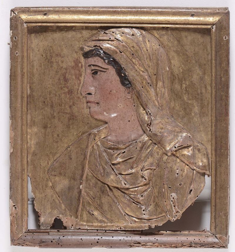 Coppia di pannelli in legno dorato raffigurante profili di personaggi, XIX secolo