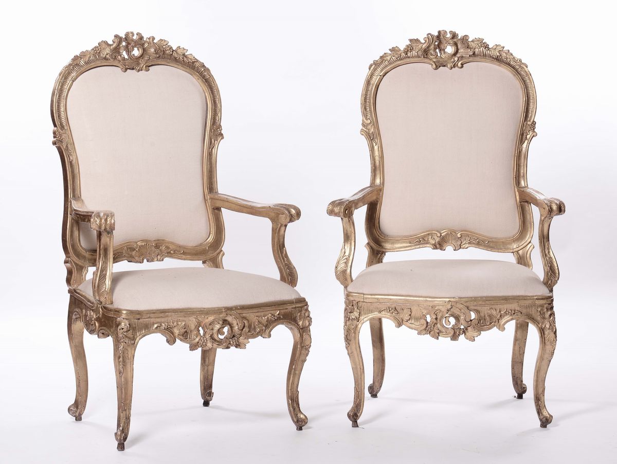 Coppia di poltrone Luigi XV in legno intagliato e dorato, XVIII secolo