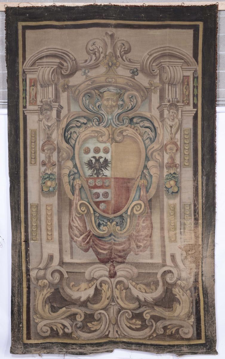 decoro con stemma centrale; uno dei due molto rovinato, cm 378x230