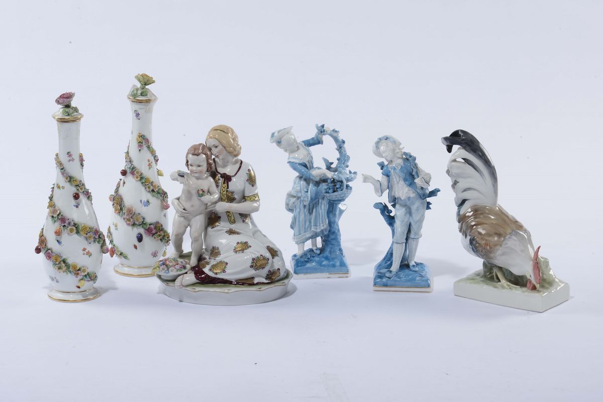 tra cui coppia di statuine con scena galante, coppia di vasi Meissen, gruppo con madre e bimbo e gallo
