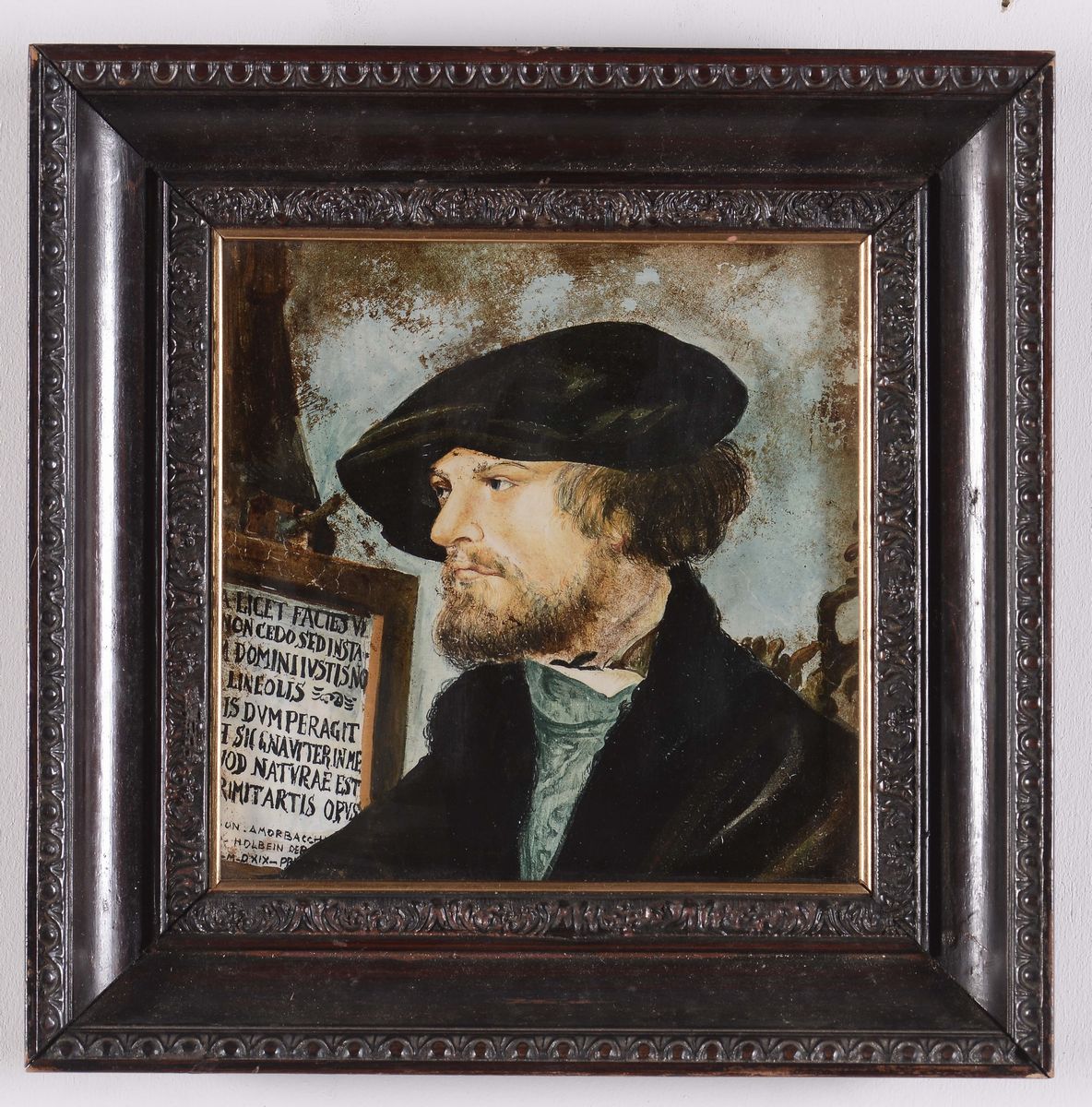 Mattonella in maiolica policroma raffigurante il ritratto di Bonifacius Amerbach. Manifattura nordica del XIX secolo