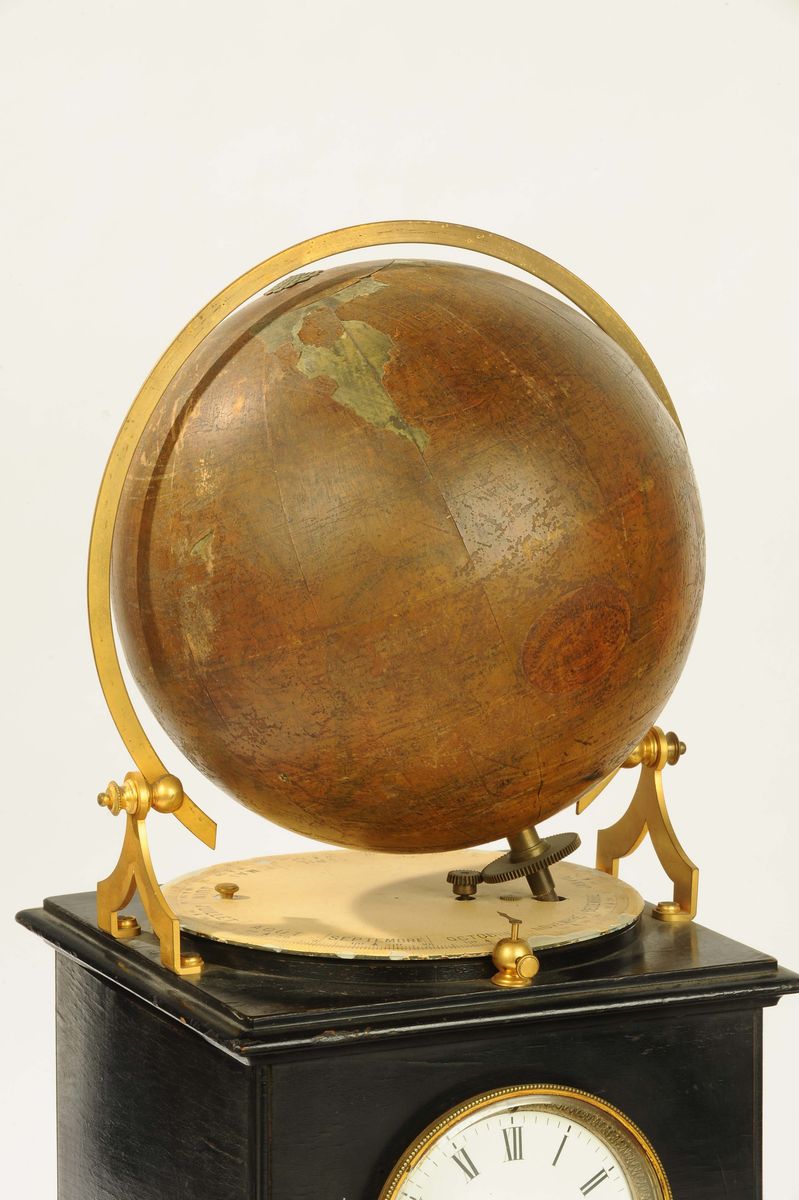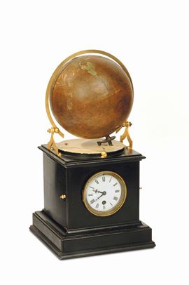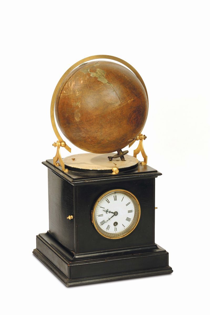 Orologio da tavolo in legno ebanizzato con globo terrestre, Francia XX secolo