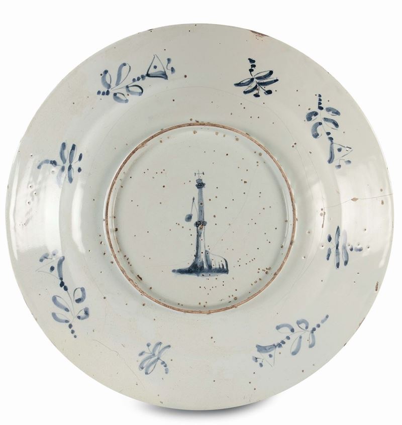 decorazione monocroma blu a tappezzeria con inserto istoriato (un guerriero a cavallo armato di lancia) al centro del cavetto, marca Lanterna, diametro cm 39,5 (difetti)