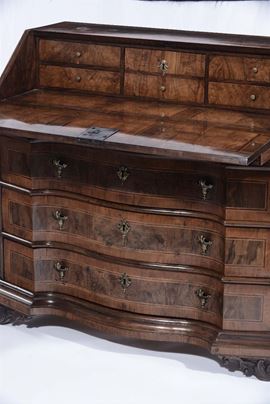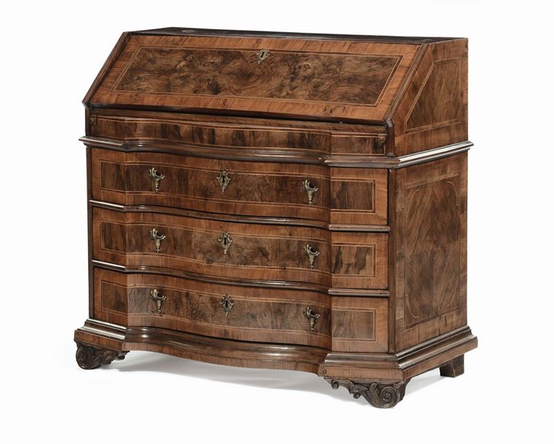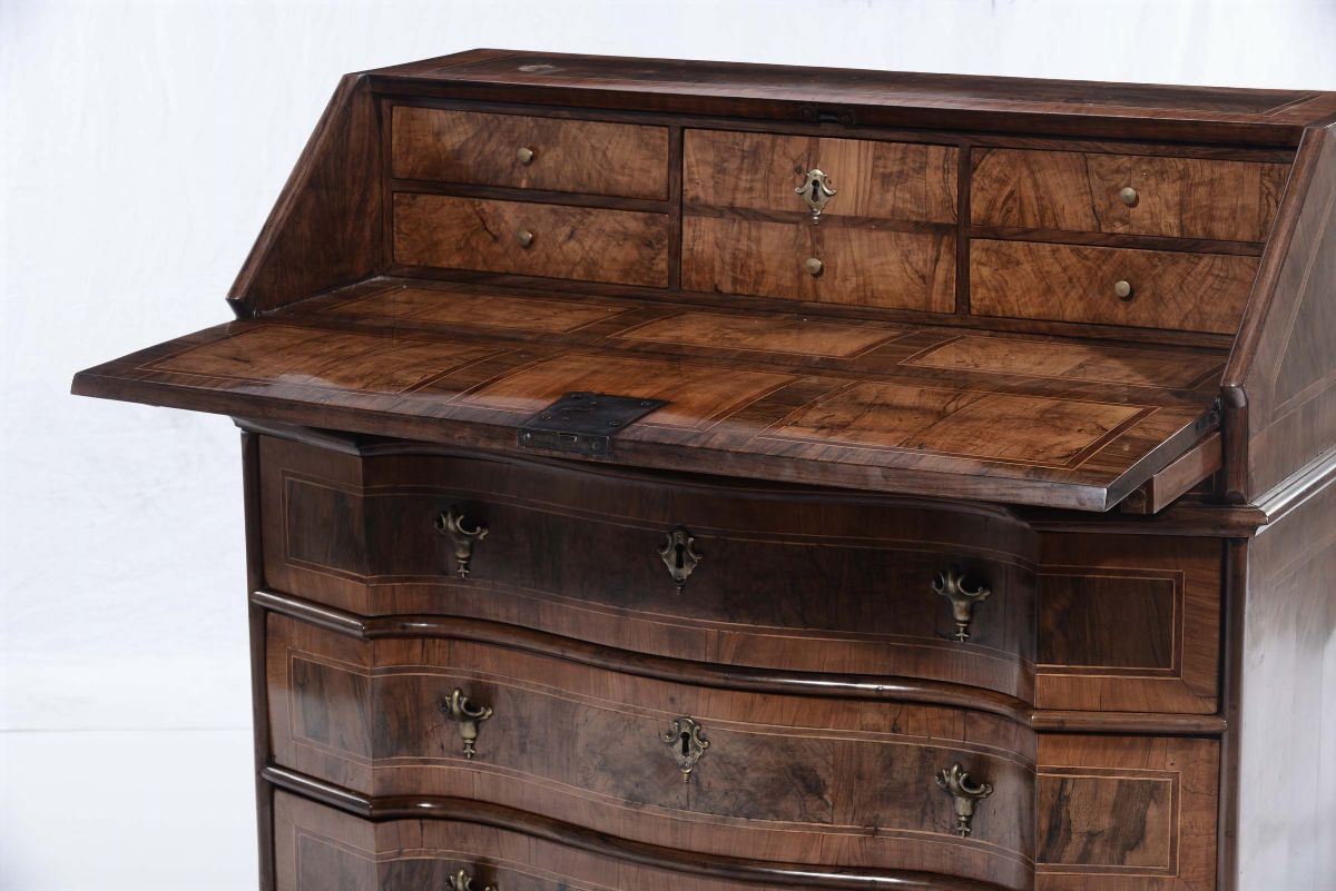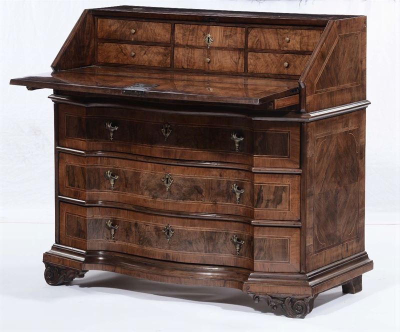 fronte mosso a tre cassetti, fianchi dritti, calatoia celante scarabattolo, piedi a mensola, cm 116x62x105