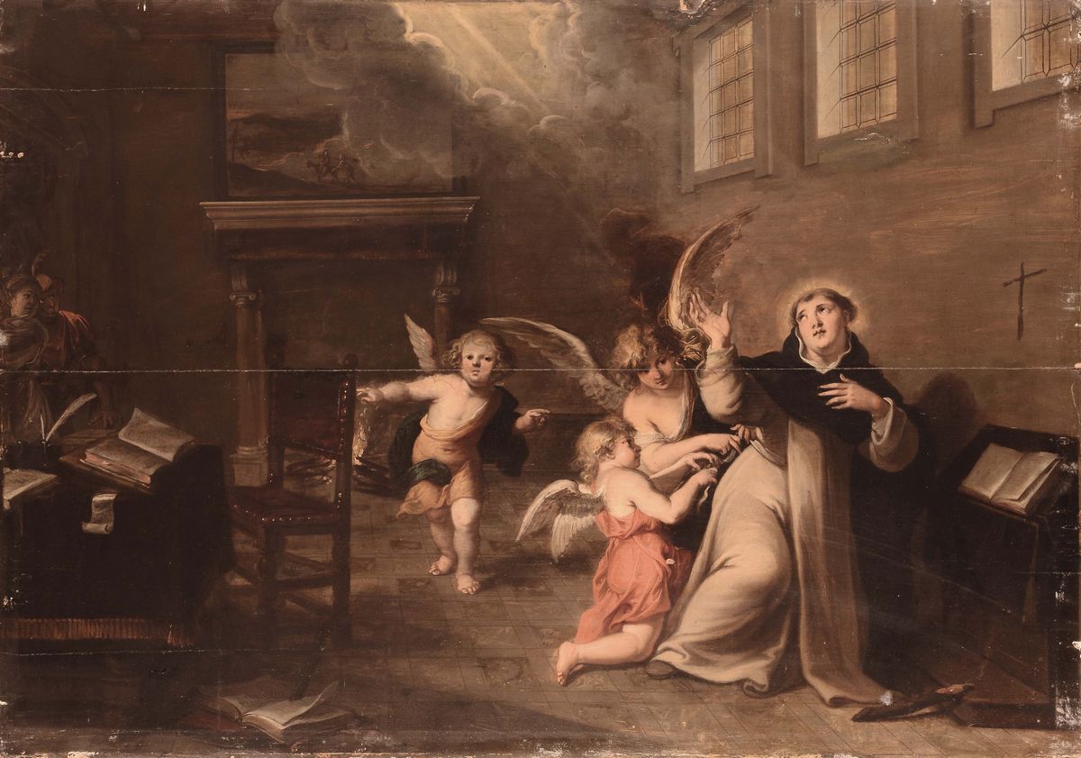 Scuola Fiamminga del XVII secolo Santo monaco con cherubini