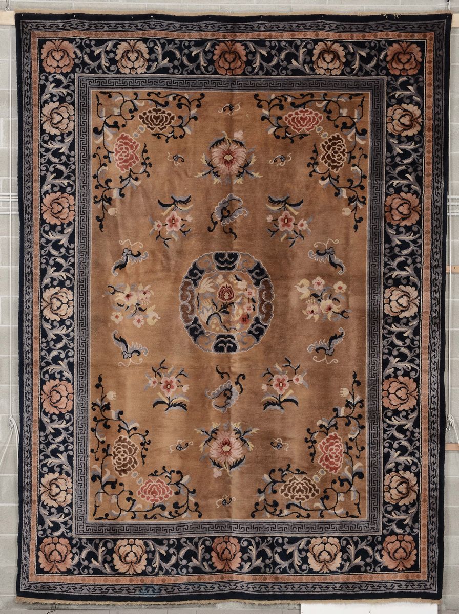 fondo giallo oro con decoro cinese, bordura blu con peonie cm 390x290