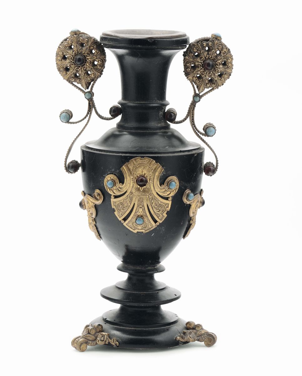 Vaso decorativo di gusto russo neomedievale eseguito in legno tornito e ebanizzato, Russia XIX secolo