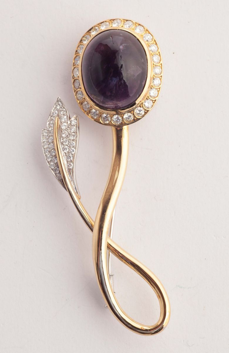 An amethyst, diamond and gold brooch