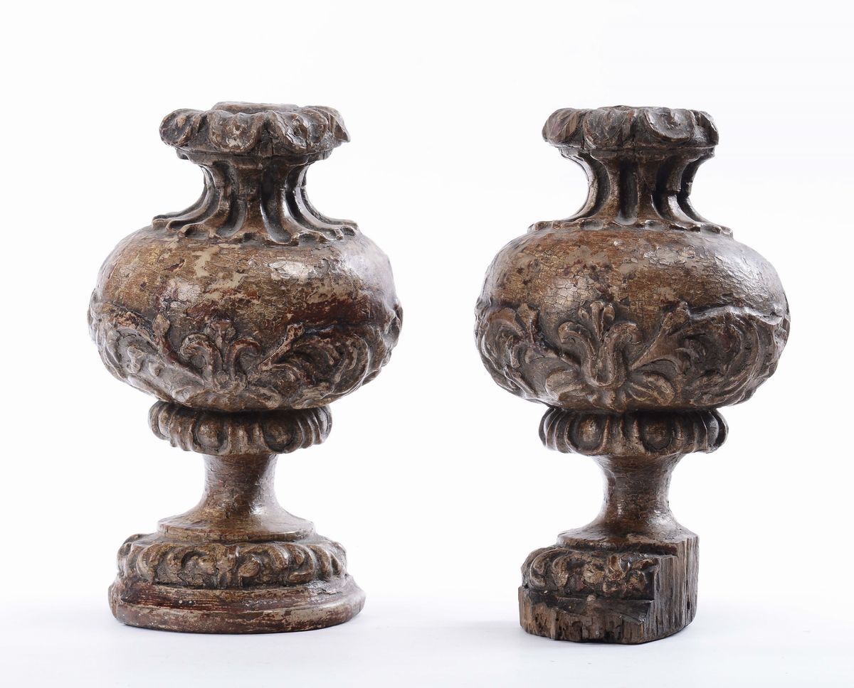 Coppia di portapalme in legno intagliato e dorato, XVII secolo
