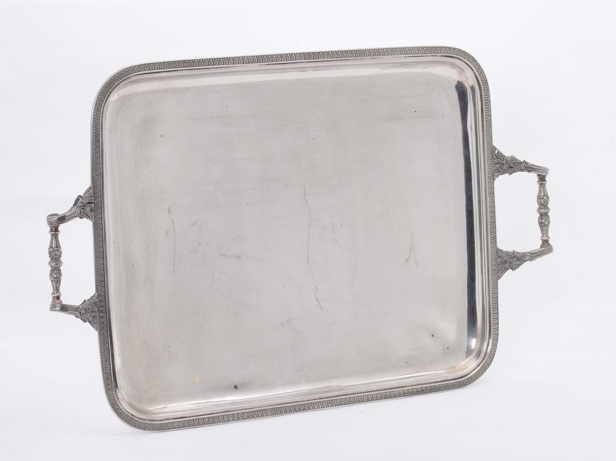 Vassoio in argento con manici lavorati, gr 1500 ca
