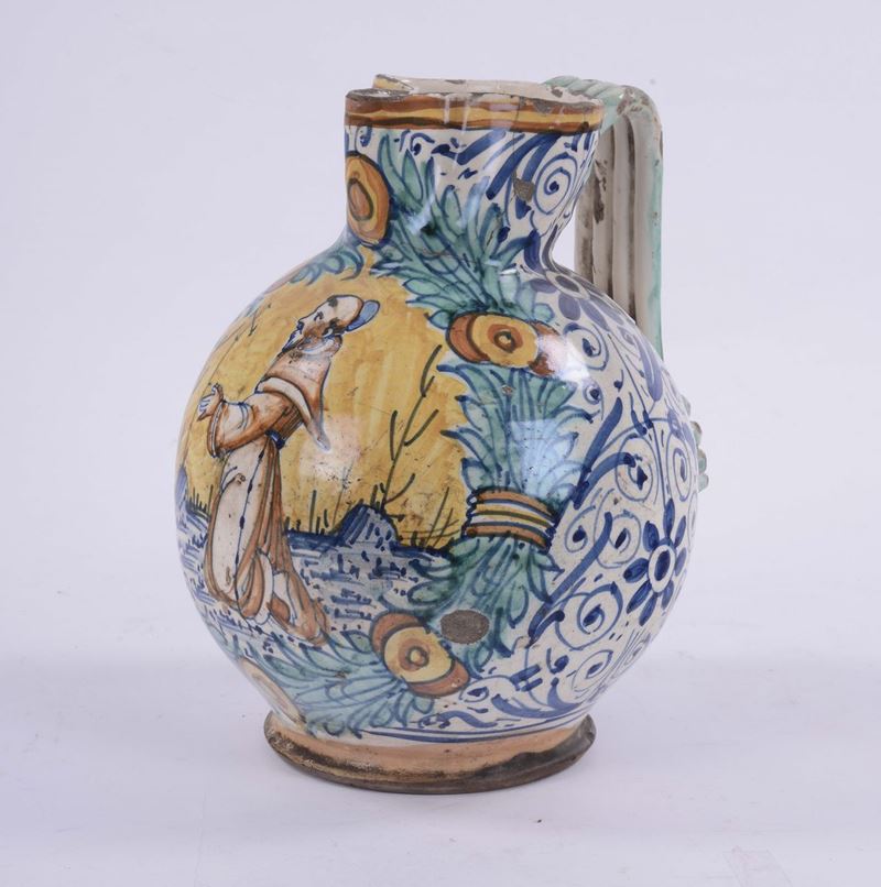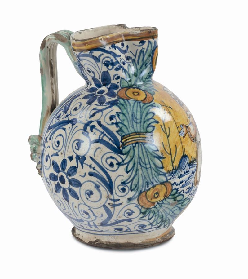 Brocca in maiolica policroma, Cafaggiolo, datata 1574