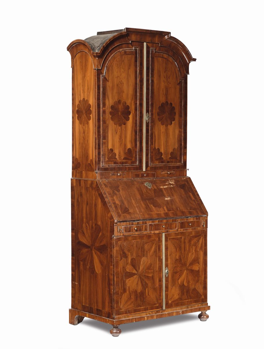 decoro di rosette sul fronte e sui fianchi, parte superiore con scomparti, scrittoio a ribalta con cassettini e vani a giorno, cm 96x60x236