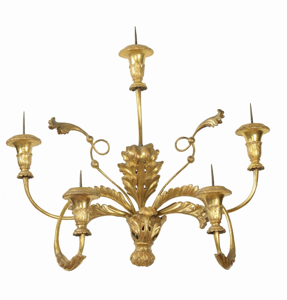 Coppia di appliques a cinque luci in legno intagliato e dorato, Italia centrale ultimo quarto XVIII secolo