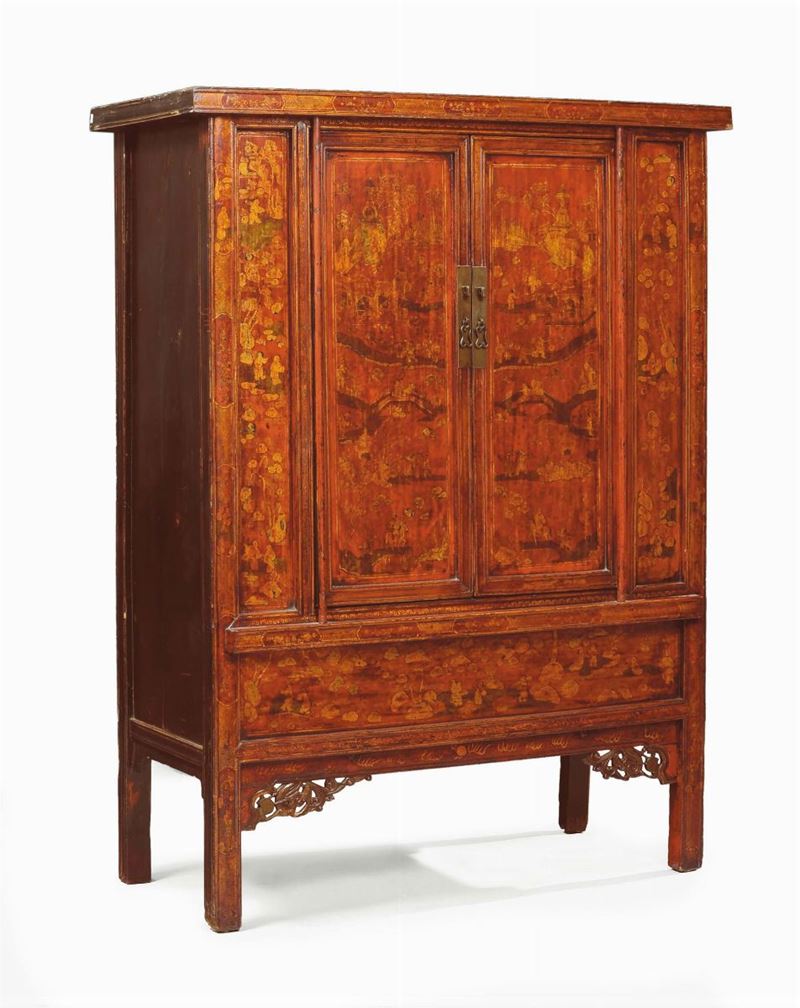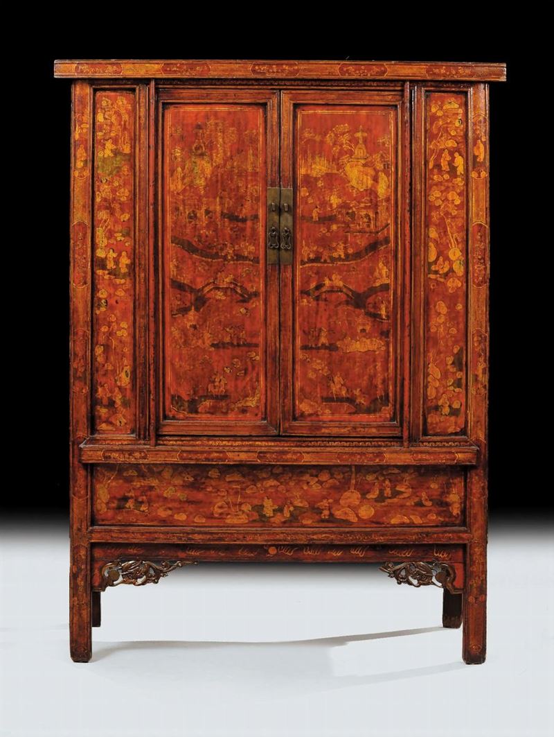 decoro sul fronte a fondo rosso con personaggi e scene di vita orientale, all’interno vano segreto, cm 141x63x192