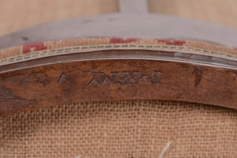 con braccioli, sottobraccioli, gambe e banchino mossi, una stampigliata P.Remy, maestro ebanista dal maggio 1750, morto nel 1798