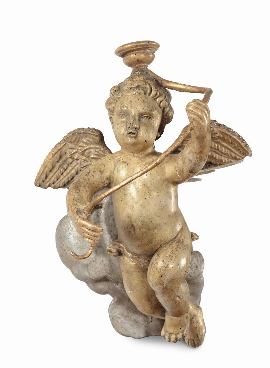 Coppie di amorini reggi cero in legno intagliato, dorato ed argentato, fine XVII secolo