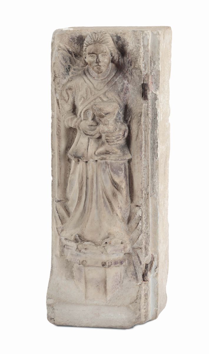 Piccola lesena in marmo con figura di angelo scolpita a rilievo che regge calice, XV secolo