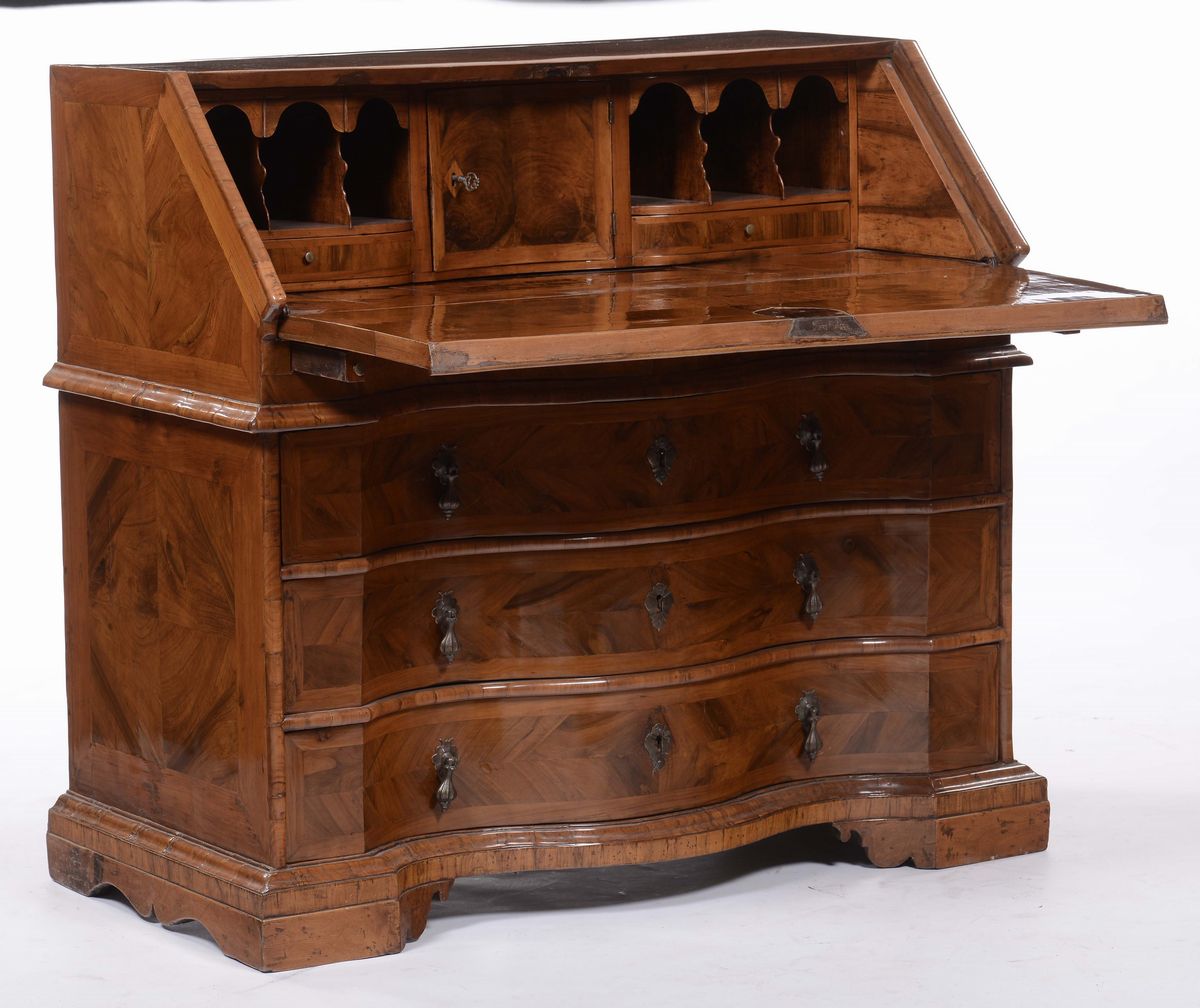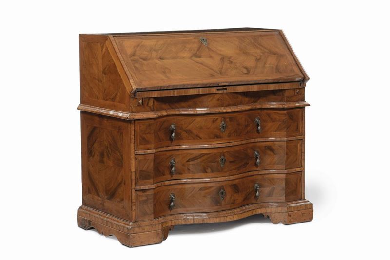 Scrivania a ribalta lastronata in radica di noce, Veneto inizi XVIII secolo