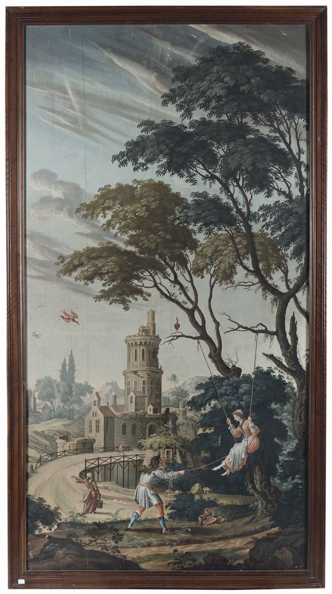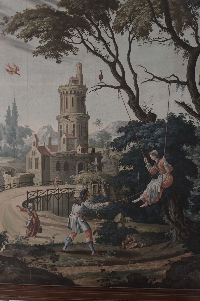 Scuola Francese o Piemontese del XVIII secolo Paesaggio con figura sull'altalena