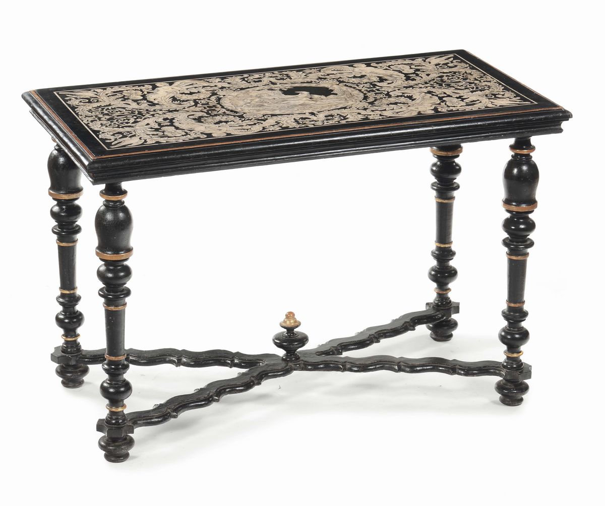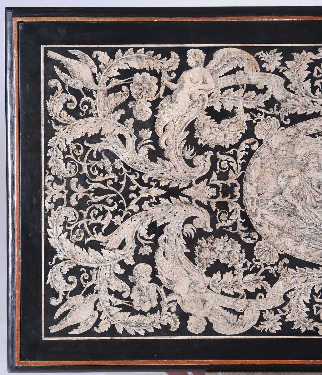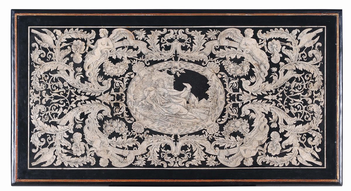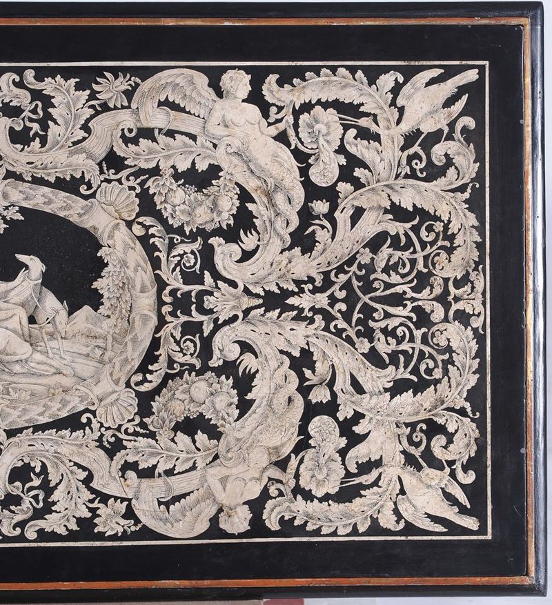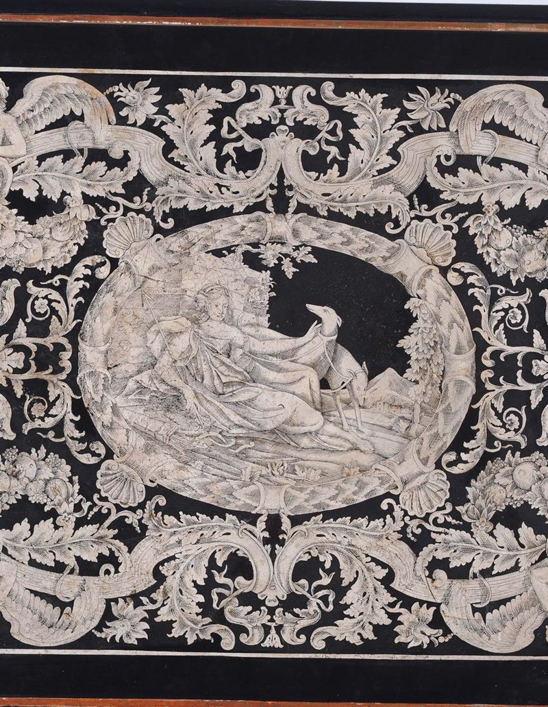 Piano di tavolo in scagliola bianco su nero decorato a motivi fitoformi e zooformi con al centro medaglione raffigurante Diana cacciatrice, struttura con gambe in legno tornito e laccato riunite da traversa a croce, cm 135x74x89