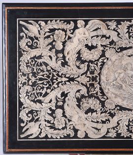 Il piano riccamente decorato a grisaille, con densi intrecci fogliacei, animali putti, frutti e fiori, è tipico degli scagliolisti dell’Emilia Romagna