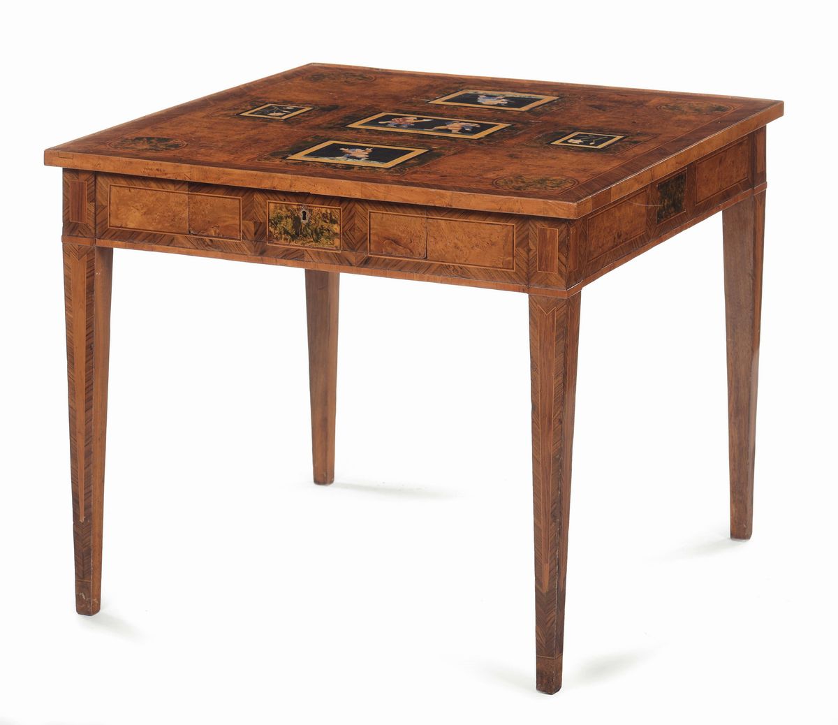 Tavolino da gioco listrato in radica di olmo e noce con placche in commessi di pietre dure, Toscana ultimo quarto del XVIII [..]