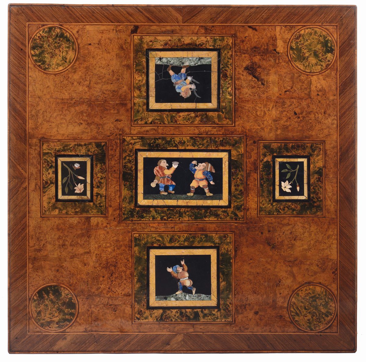 decorato da filettature in legni vari che incorniciano cinque placche di pietre dure. Due placche raffigurano “ramo di fiore con foglie”, le altre tre “soggetti caricaturali” rappresentativi di un filone della produzione seicentesca delle botteghe granducali di Firenze, ispirato ai disegni di Baccio del Bianco, cm 90x90x78