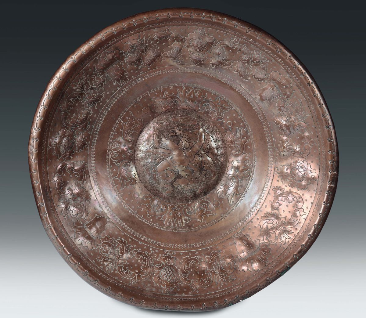 A large embossed and chiselled copper concave basin, northern Italian art, 17th-18th century