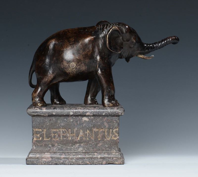 A molten and chiselled bronze elephant sculpture, Italian or German art, 16th century, marble base with inscriptions “Elephantus” [..]