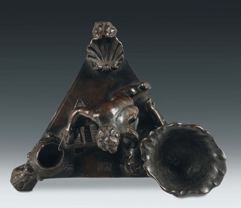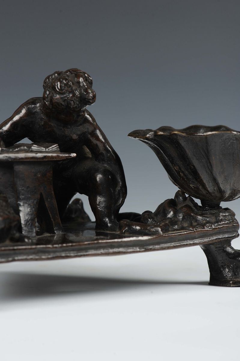 L’articolato calamaio si sviluppa poggiando su una base triangolare sorretta da piedi leonini. Al centro un fanciullo inginocchiato sfoglia le pagine di un libro che poggia su uno sgabello, attorniato da una tartaruga, una grande vasca a volute posta su un fuoco da cui escono serpenti e altri rettili e da una conchiglia collocati sulle tre cuspidi della base. L’ inusuale iconografia dai rimandi esoterici è sviluppata nei modi della produzione artistica derivata dall’antico iniziata a Padova nel XV secolo e diffusasi oltralpe