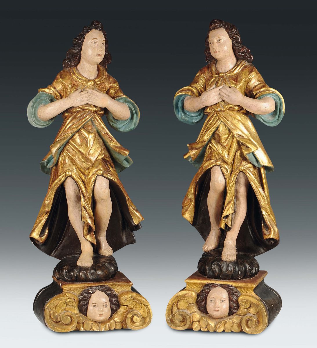 A pair of polychrome and gilt wood sculpture representing praying angels, Lombard school, 17th -18th century