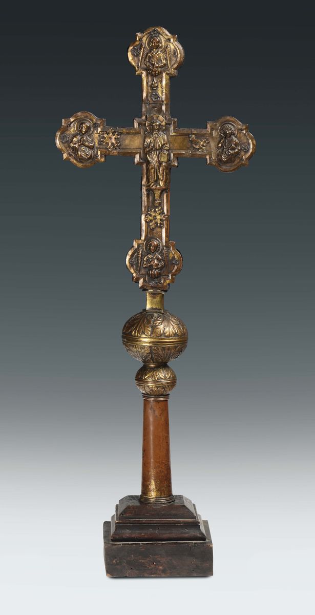 An embossed and chiselled copper processional cross with gilt traces, late-Gothic goldsmith, northern Italy, 15th century [..]