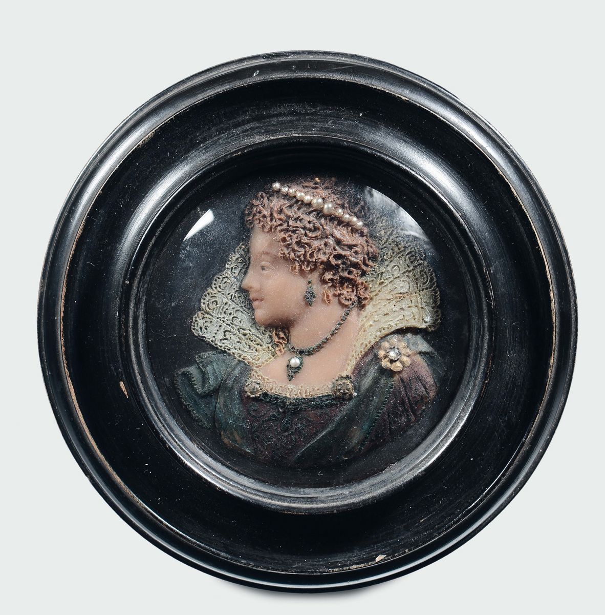 Polychrome wax noble woman profiles on circular slate support, wax modeller, 18th - 19th century (England?) within gilt and ebonized wood frame