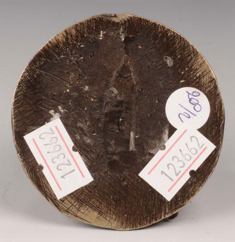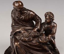 Rara composizione in bronzo finemente cesellato rappresentante due gruppi. Uno con figura di anziano, seduto su uno scranno poggiante su libri (Omero?), volge lo sguardo al cielo con accanto un putto che gli porge una lampada ad olio. Il secondo raffigurante anziano con una fluente barba (Diogene?) seduto su un baule da viaggio che volta la testa e lo sguardo dal putto che gli volge le mani sulle sue ginocchia. La rara iconografia che si sviluppa nei modelli tardo manieristici, replicata in maniera seriale, come spesso è comune alla produzione di bronzetti fra XVI e XVII secolo e la raffinata esecuzione della fusione e della cesellatura fanno pensare all’opera di una bottega prossima agli scultori Alessandro Vittoria o Gerolamo Campagna