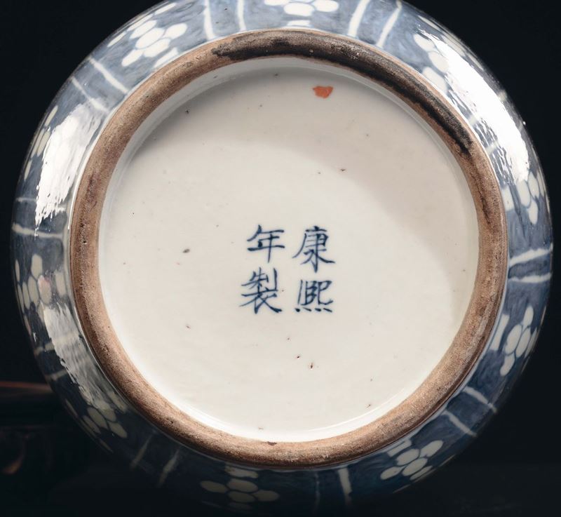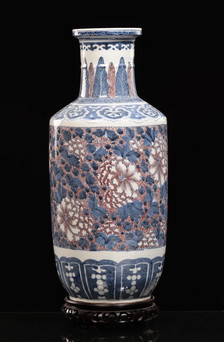 A blue and white porcelain ruleau vase with iron red floral decoration, China, Qing Dynasty, 19th century