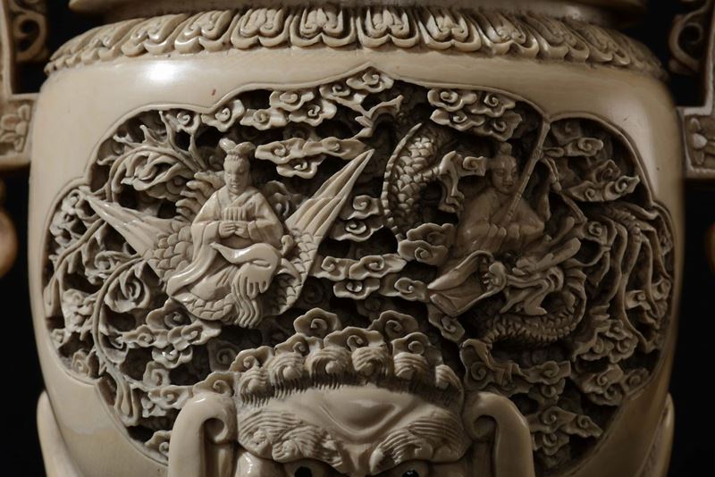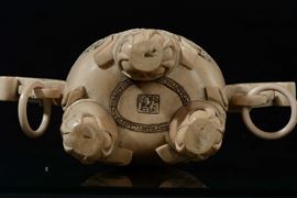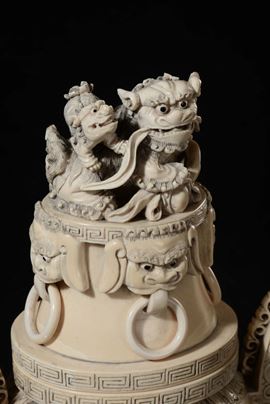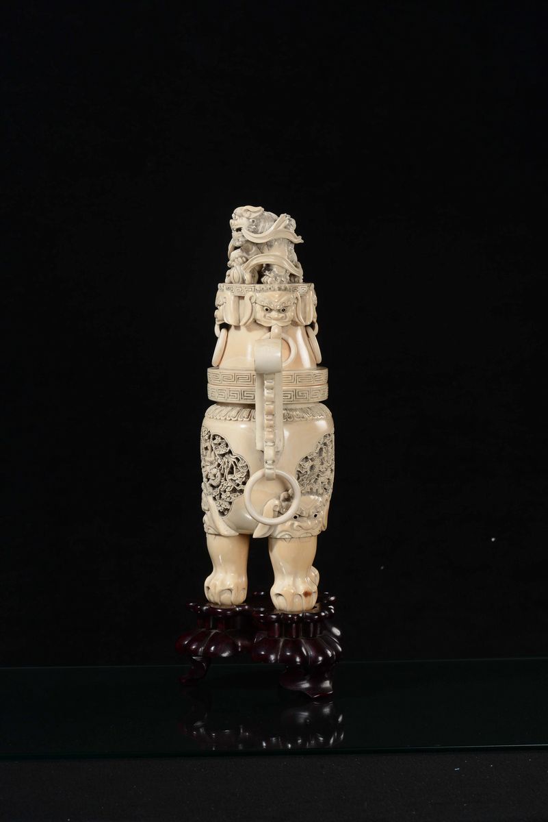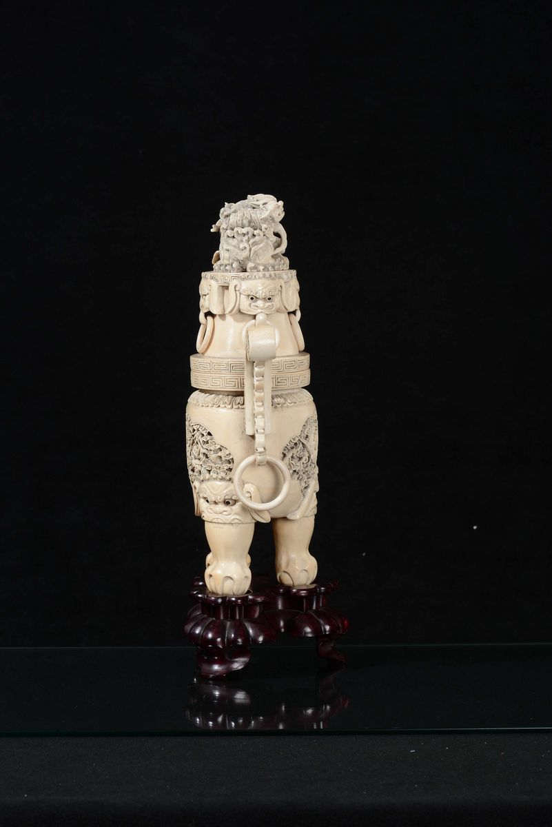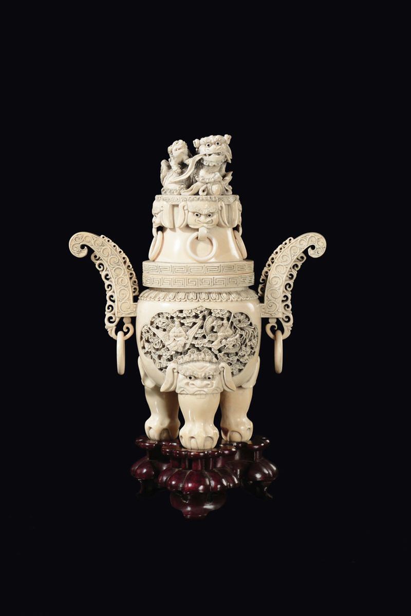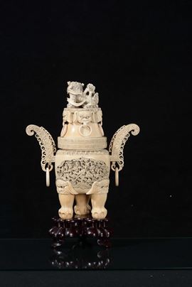 A carved ivory censer and cover with decorated with Pho dogs and characters, China, early 20th century