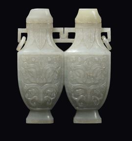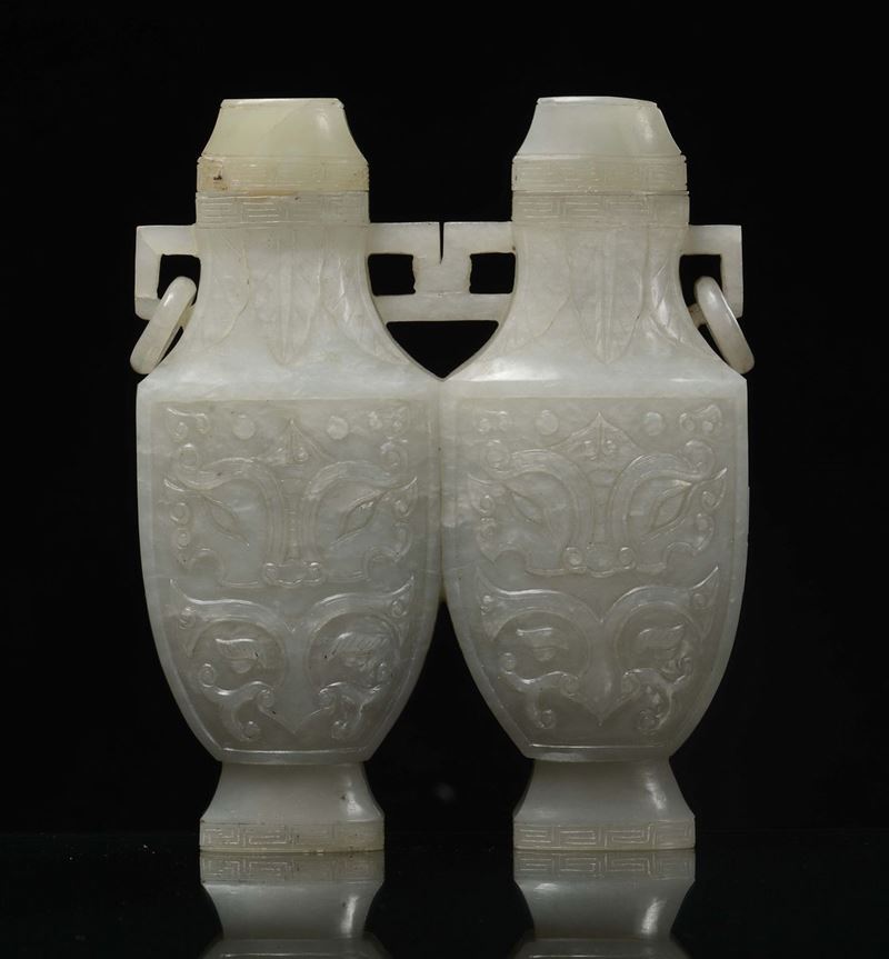 A Celadon white jade double vase carved with archaic taste, China, Qing Dynasty, 19th century