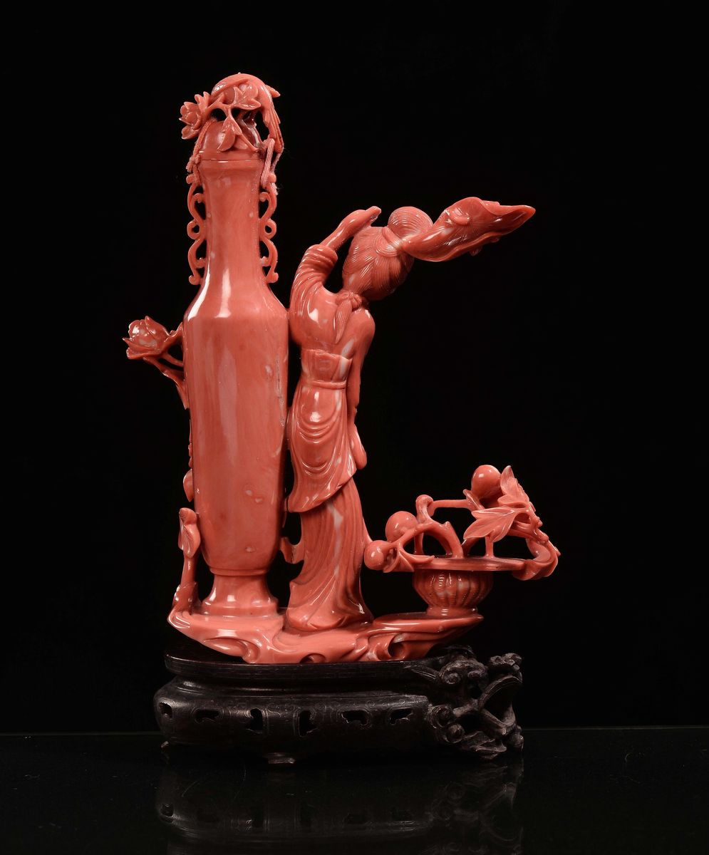 A coral Guanyin with bottle and flowers, China, Qing Dynasty, late 19th century