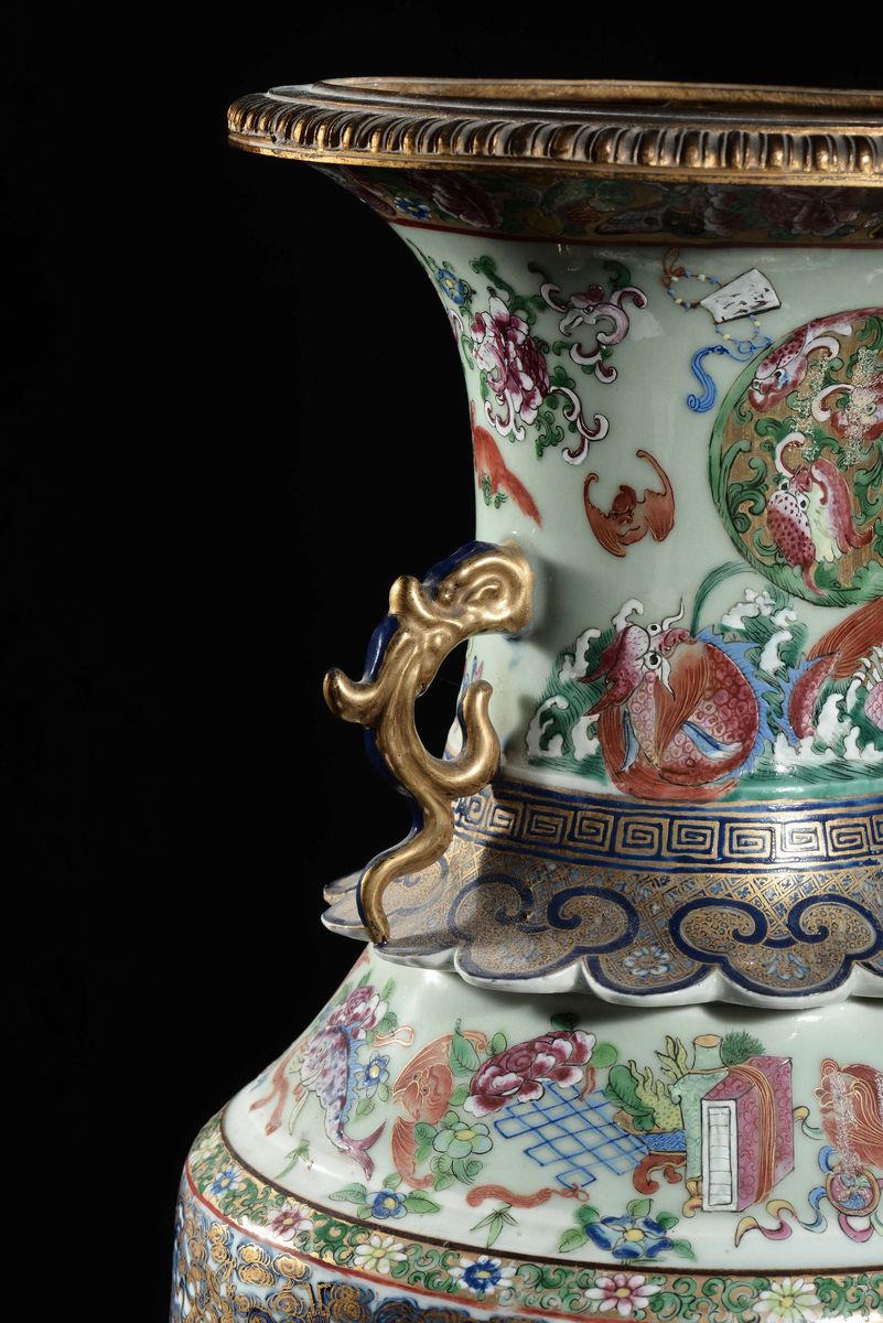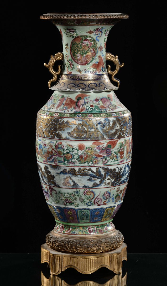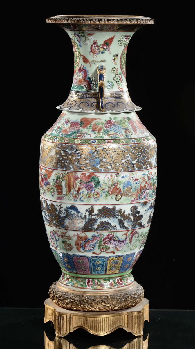 A Famille Rose Imari porcelain vase in a gilt bronze base with naturalistic decoration, China, Qing Dynasty, Daoguang period [..]