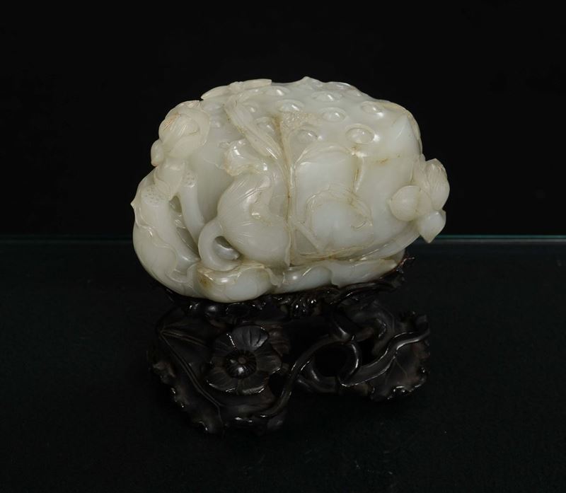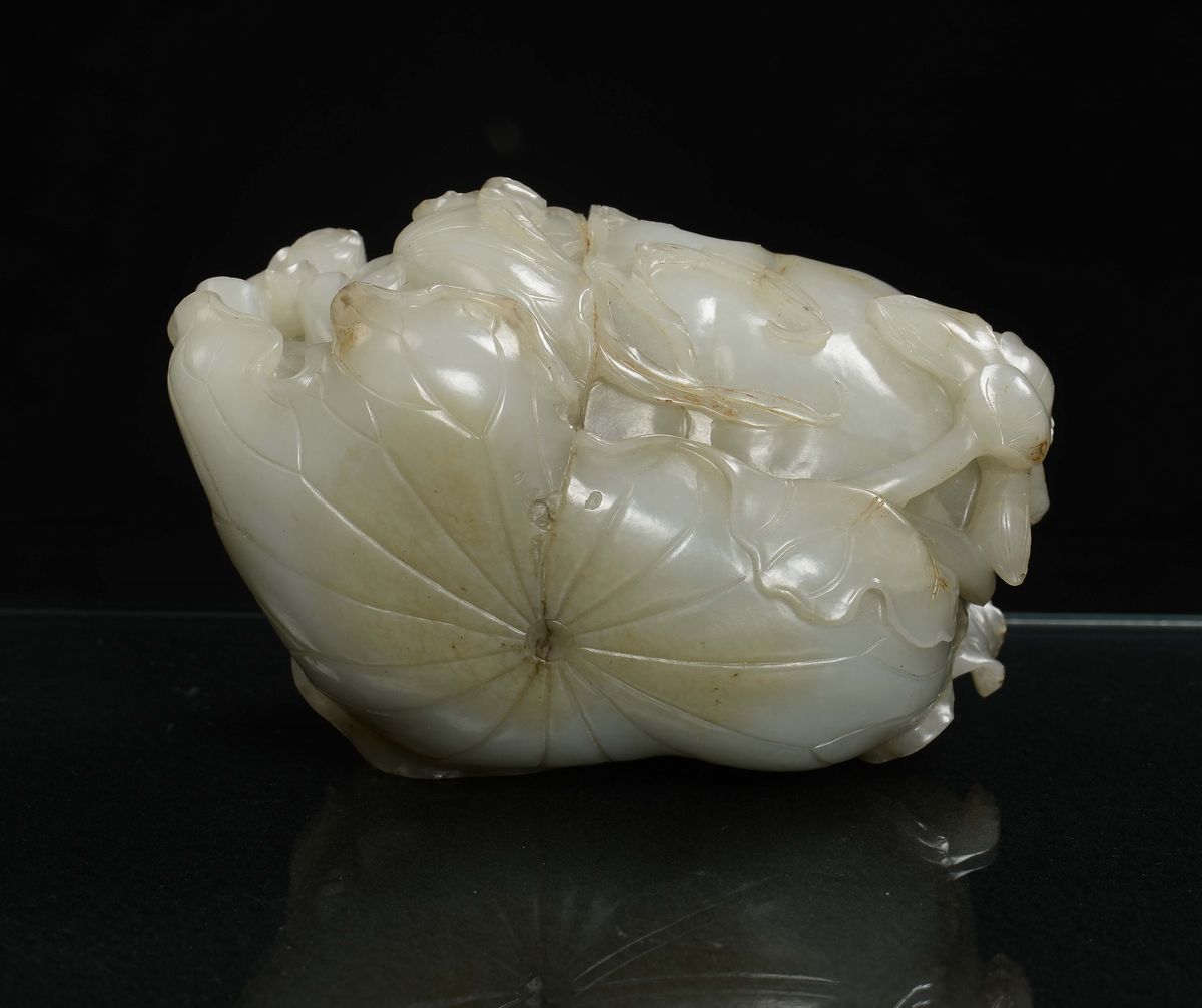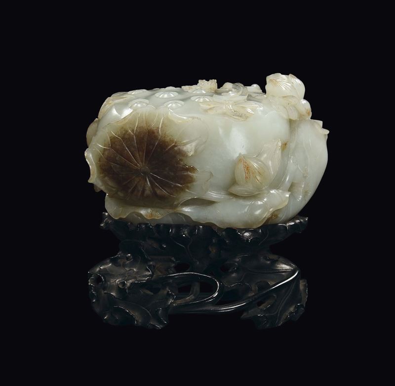 A fine Celadon white jade and russet “lotus flower” group, China, Qing Dynasty, Qianlong period (1736-1796)