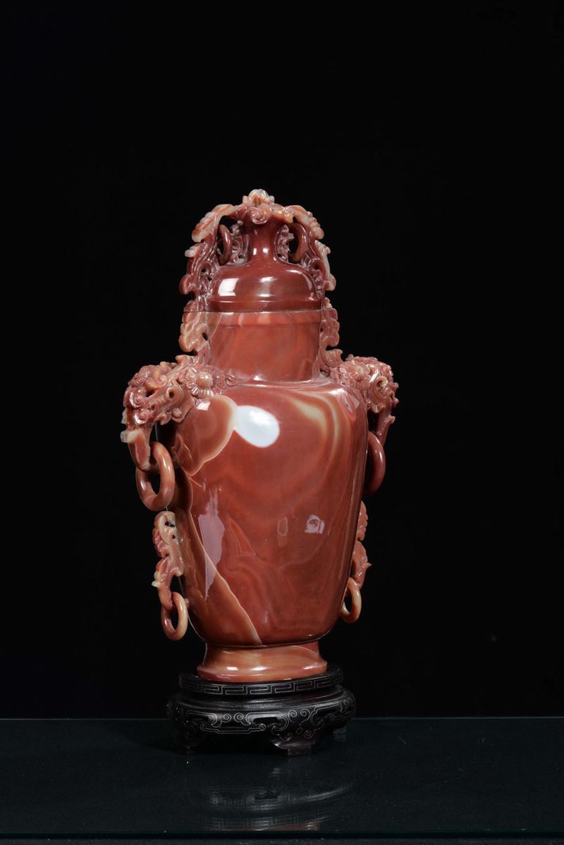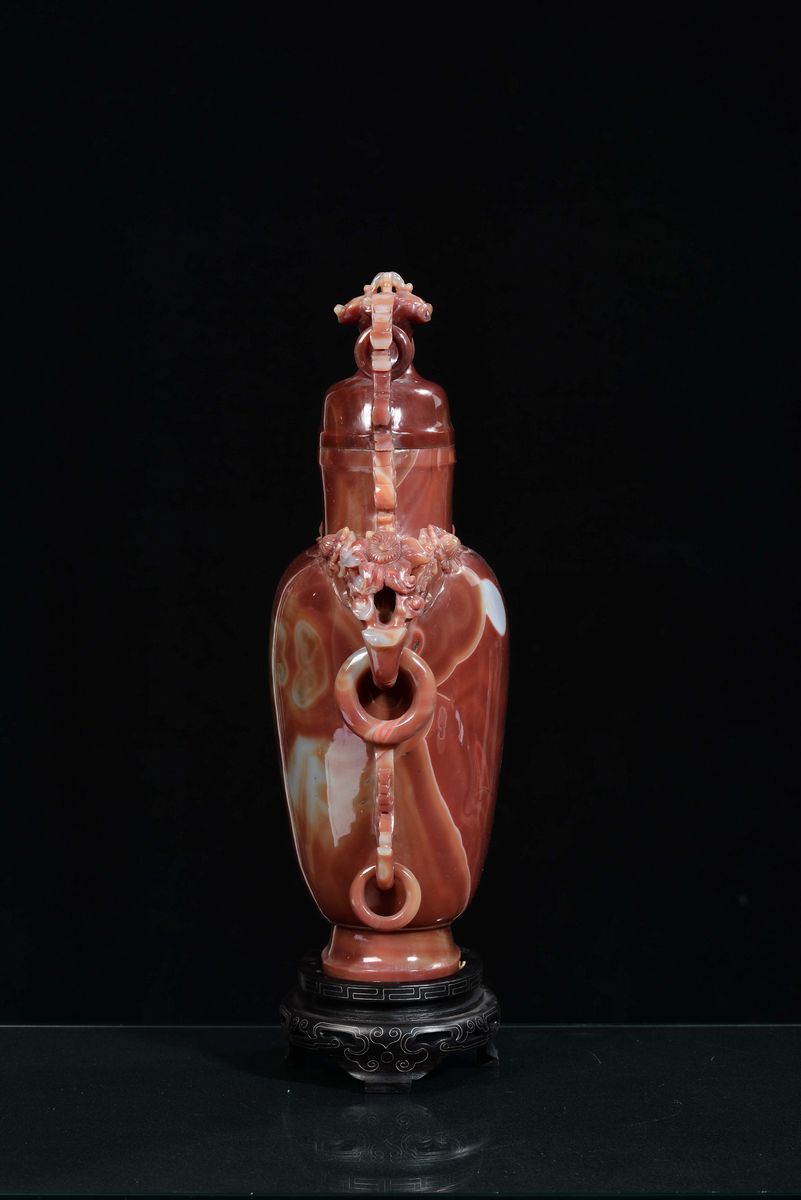 A large agate or orange cornelian vase with handles and rings, China, Republic, 20th century