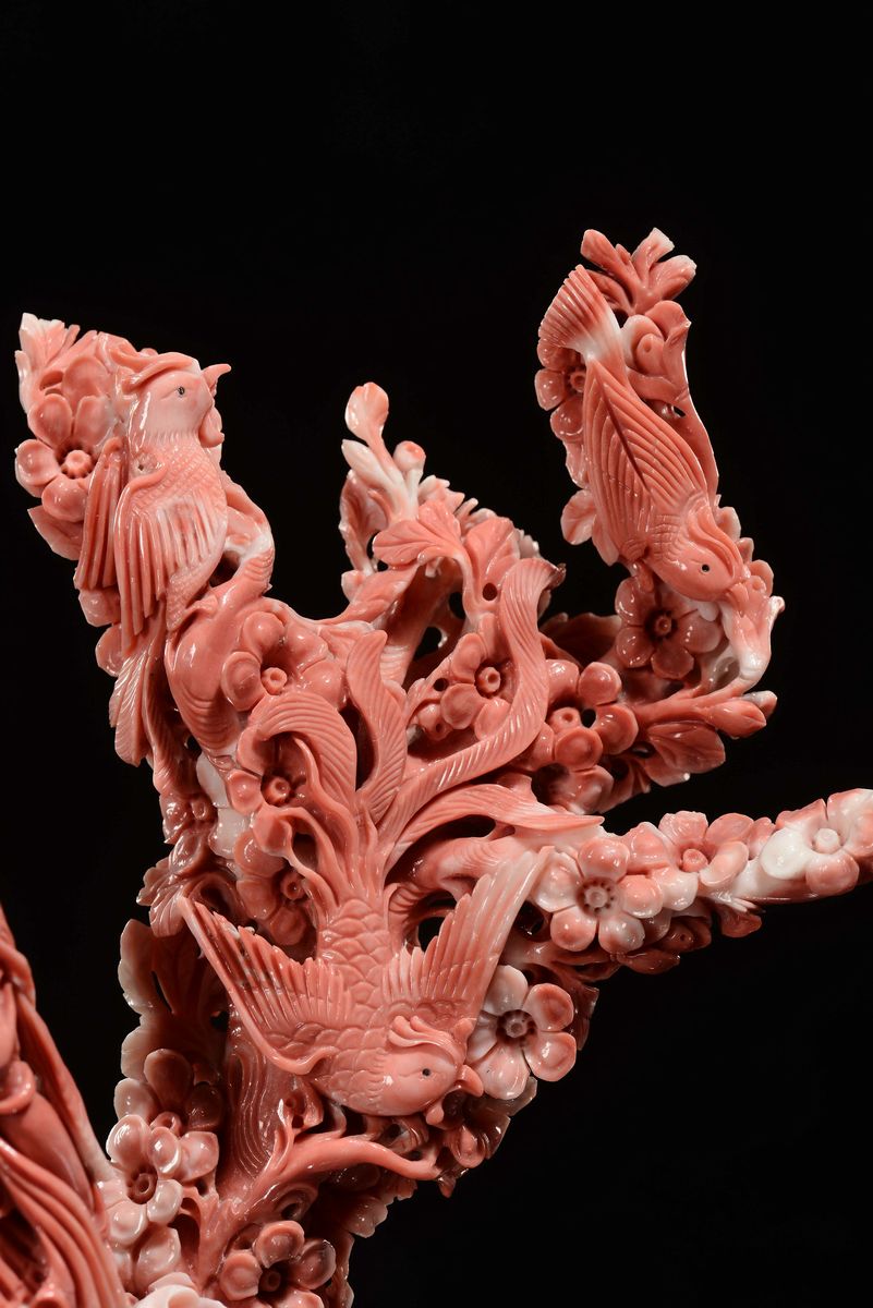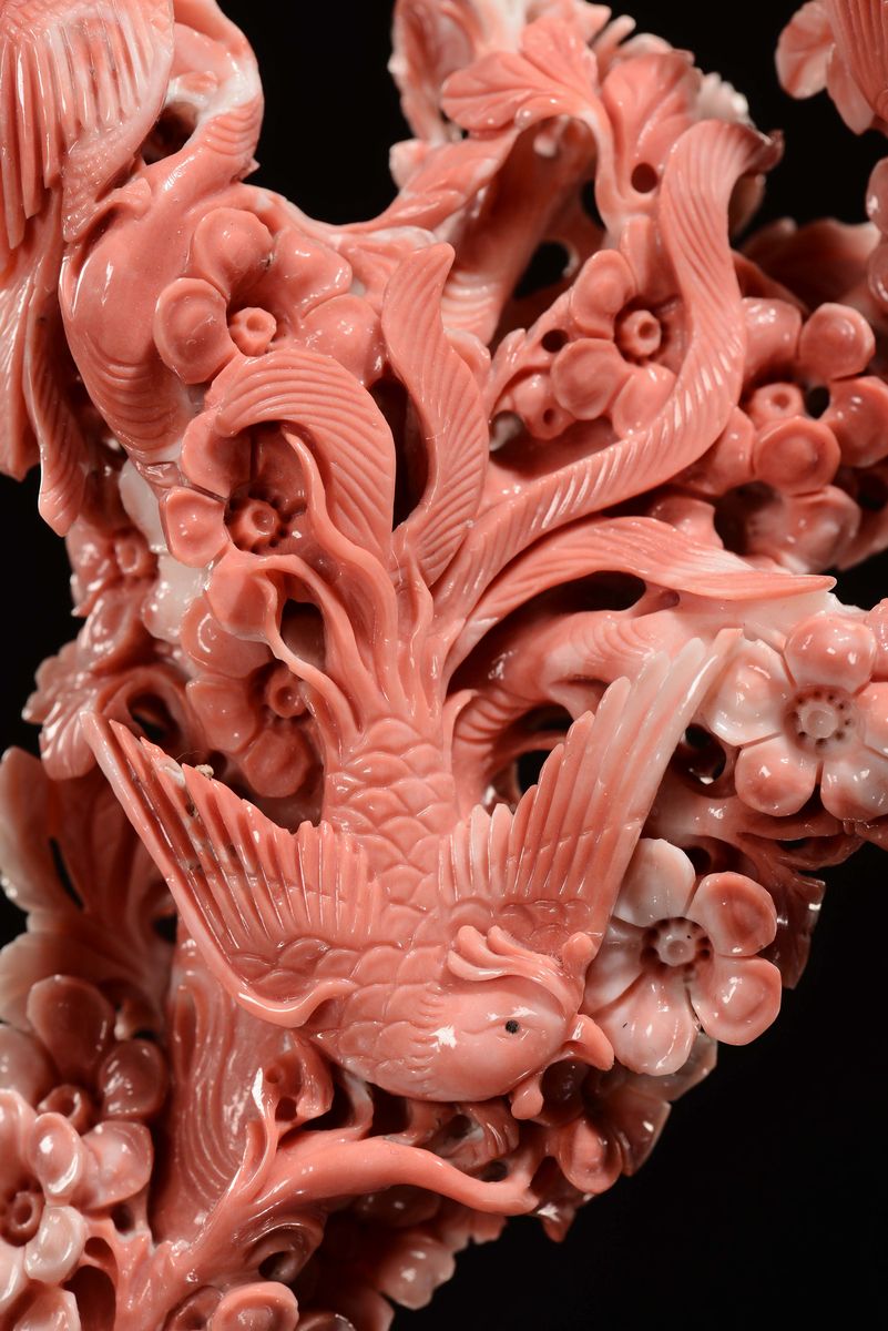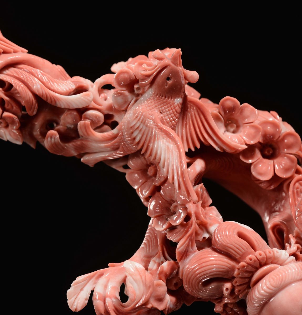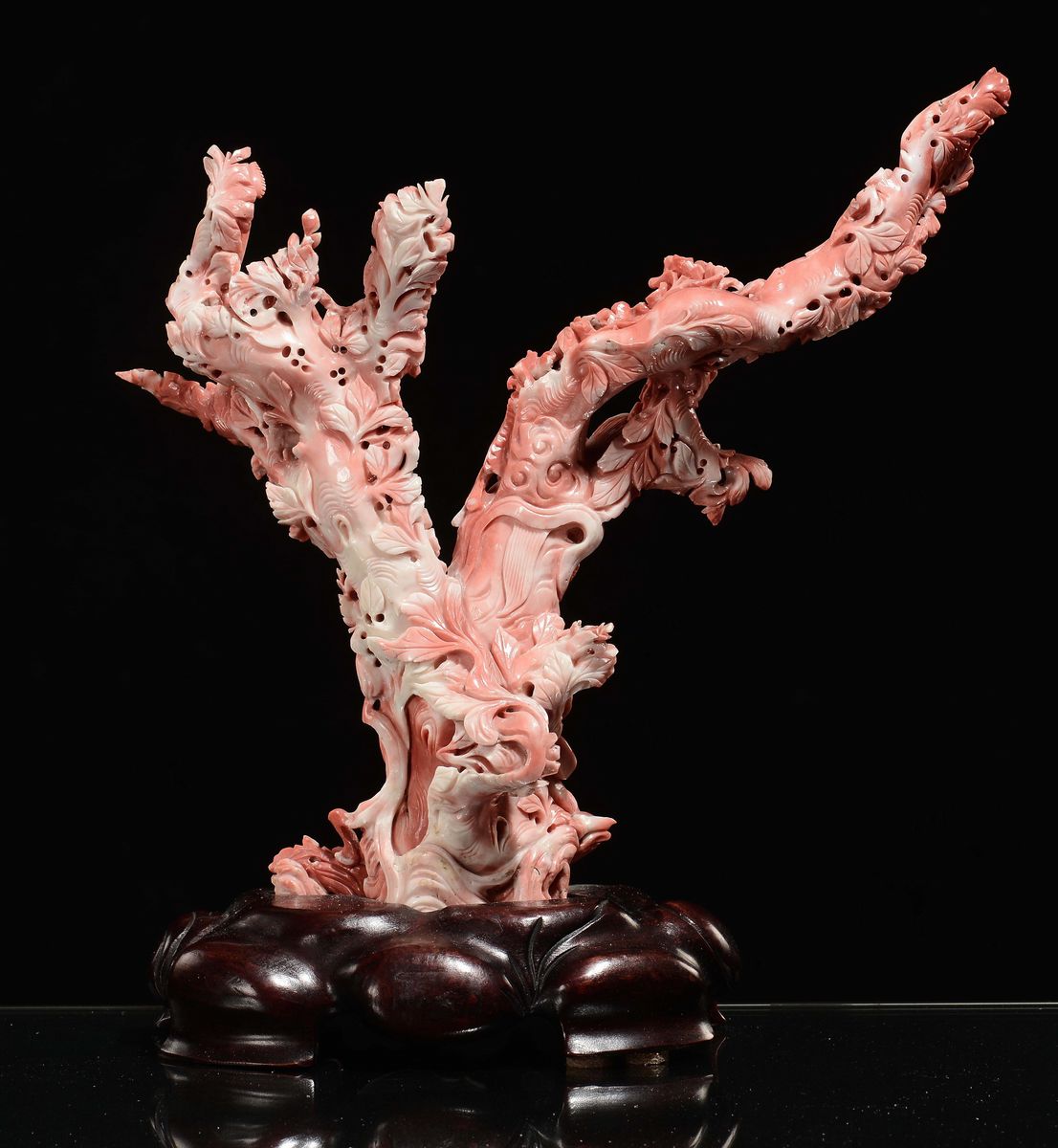 A large coral “Guanyin with boys” sculpture with wooden base, China, Qing Dynasty, late 19th century