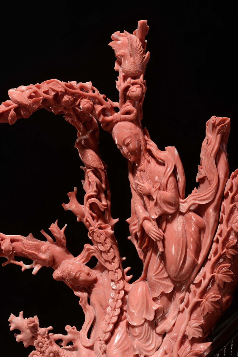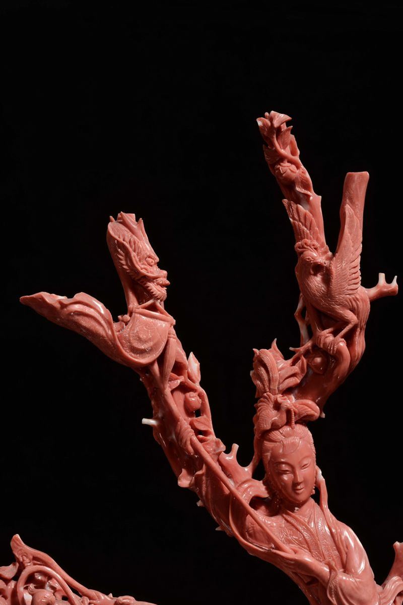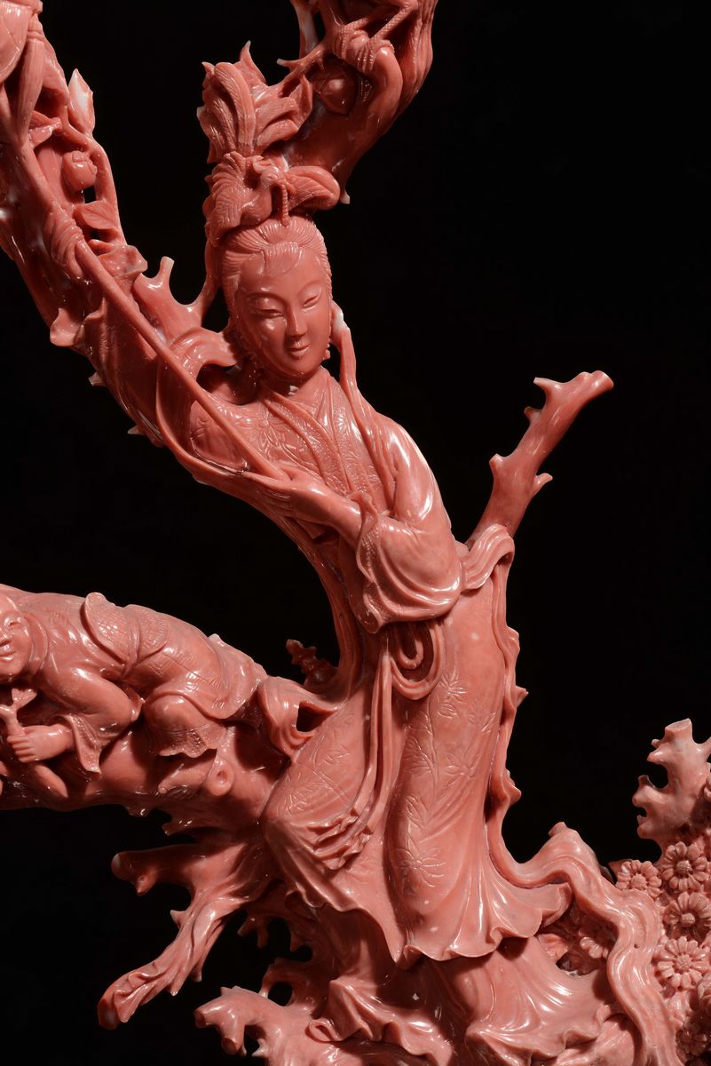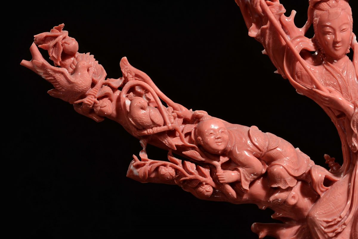 A large coral “three Guanyin” group, China, Qing Dynasty, late 19th century