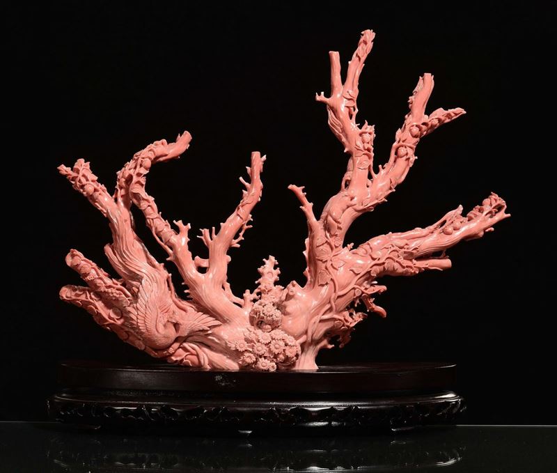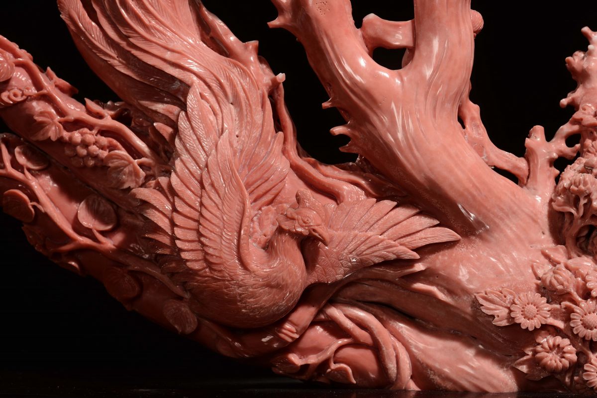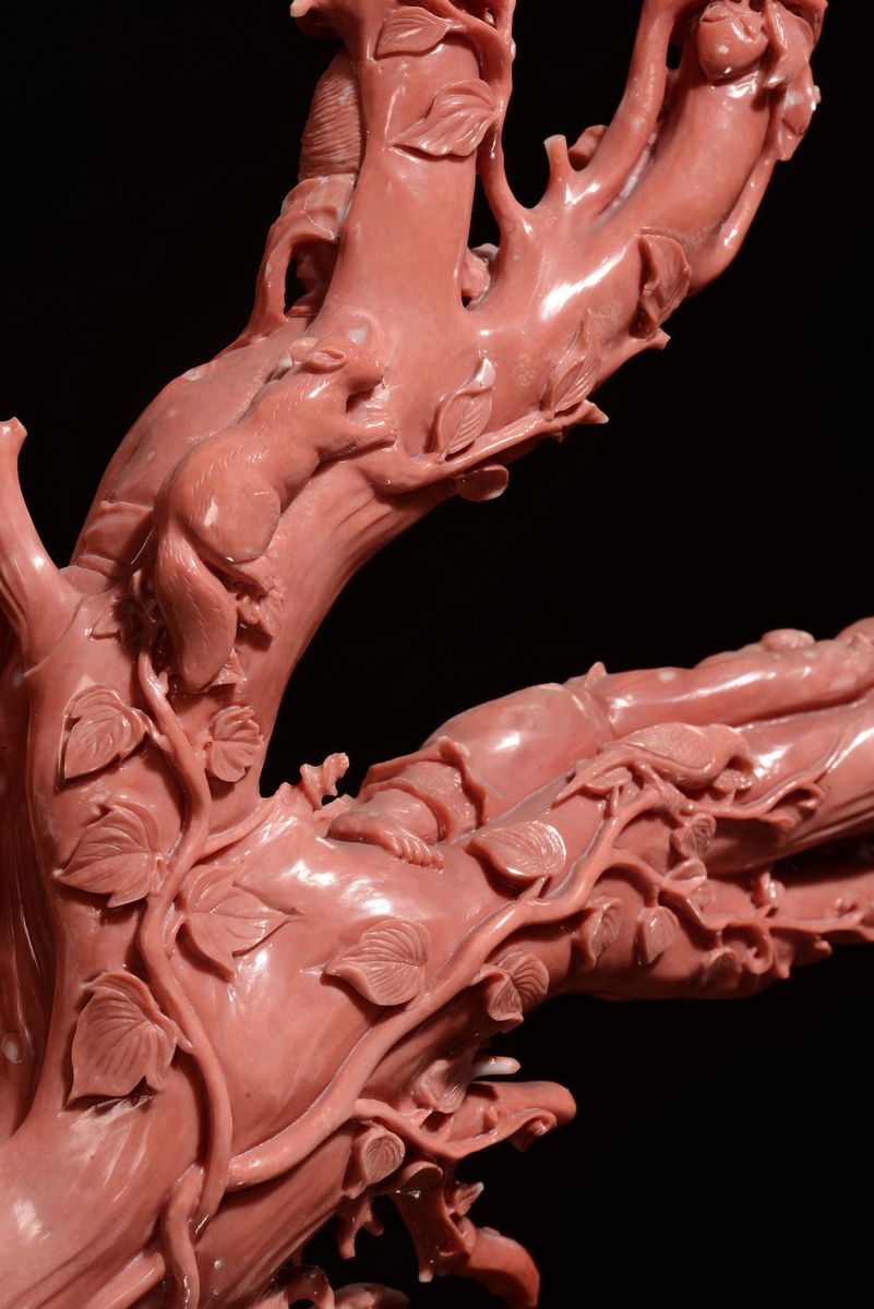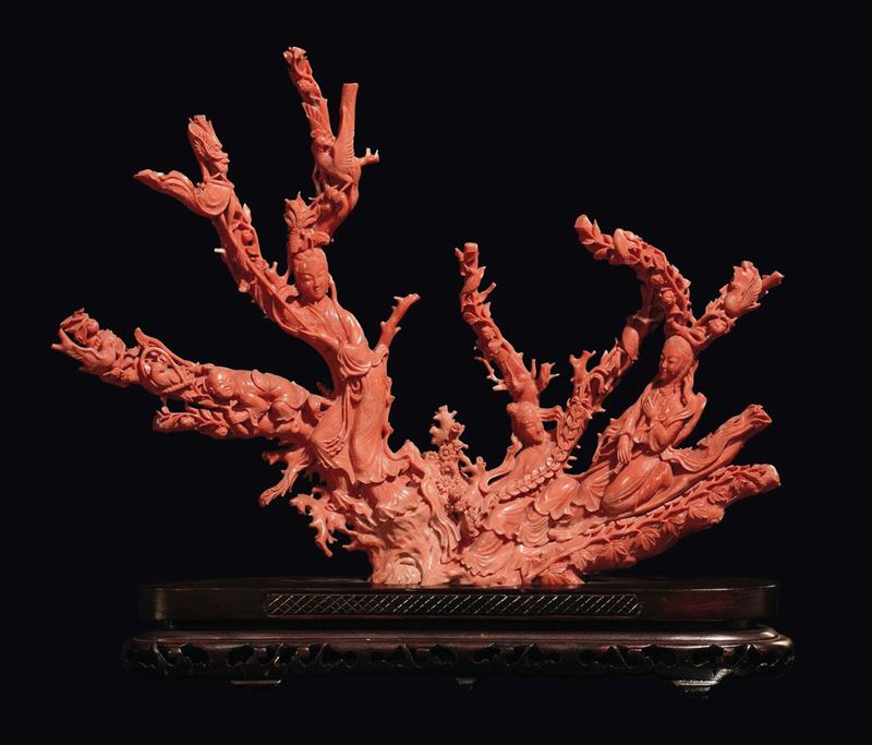A large coral “three Guanyin” group, China, Qing Dynasty, late 19th century