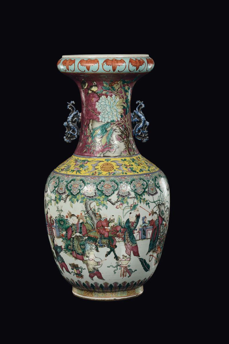 A large two-handled Famille Rose vase with everyday life scenes, China, Qing Dynasty, Daoguang period (1821-1850)