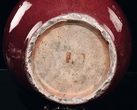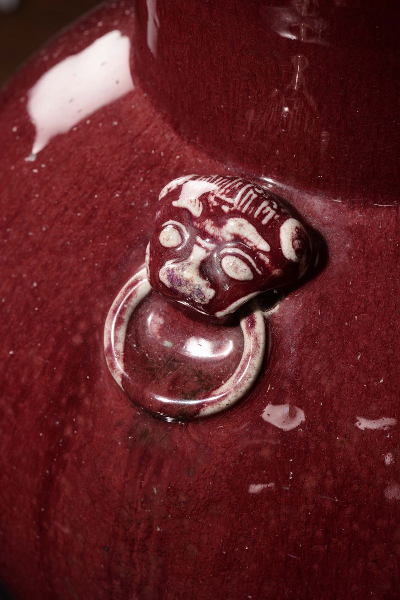 A monochrome flambè red porcelain vase with mask handles, China, Qing Dynasty, early 19th century